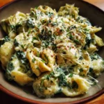 Of all the recipes that have graced my family’s dinner table, few have achieved the legendary status of this Creamy Spinach and Artichoke Pasta. It started as a weeknight experiment, an attempt to transform our favorite party dip into a substantial, satisfying meal. I was skeptical if the magic of that dip could translate into a full-fledged pasta dish, but the moment of truth came when my notoriously picky eater, who usually scrutinizes every green speck, took a second heaping spoonful without a word. That quiet endorsement was the only five-star review I needed. This dish has since become our go-to for everything from hectic Tuesdays to celebratory Sunday dinners. It’s the ultimate comfort food, a velvety, decadent hug in a bowl that brilliantly combines the earthy notes of spinach, the tangy bite of artichoke hearts, and a luxuriously creamy sauce that clings to every single piece of pasta. It feels gourmet, like something you’d order at a nice Italian restaurant, yet it comes together with surprising ease right in your own kitchen. This isn’t just a recipe; it’s a memory-maker, a guaranteed crowd-pleaser, and a delicious secret weapon in my cooking arsenal.
