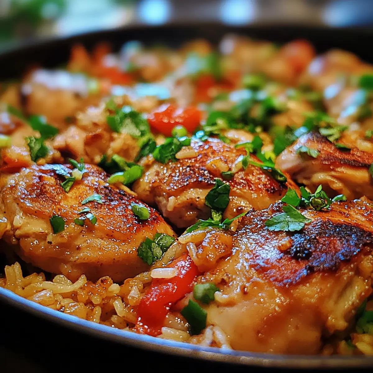 - Nestle & Simmer: Nestle chicken thighs back into the pan, skin-side up. Cover, reduce heat to low, and simmer for 18–20 minutes until rice is tender and liquid is absorbed.