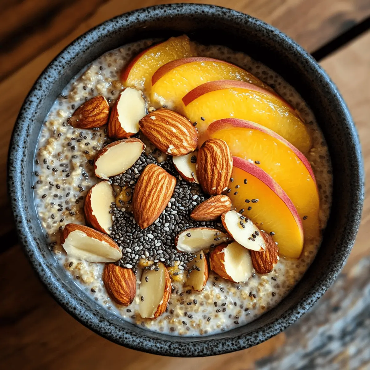 - Assemble: Spoon the chilled chia oats into serving bowls, arrange peach slices and toasted almonds on top, then drizzle any extra honey or peach syrup for a juicy finish.