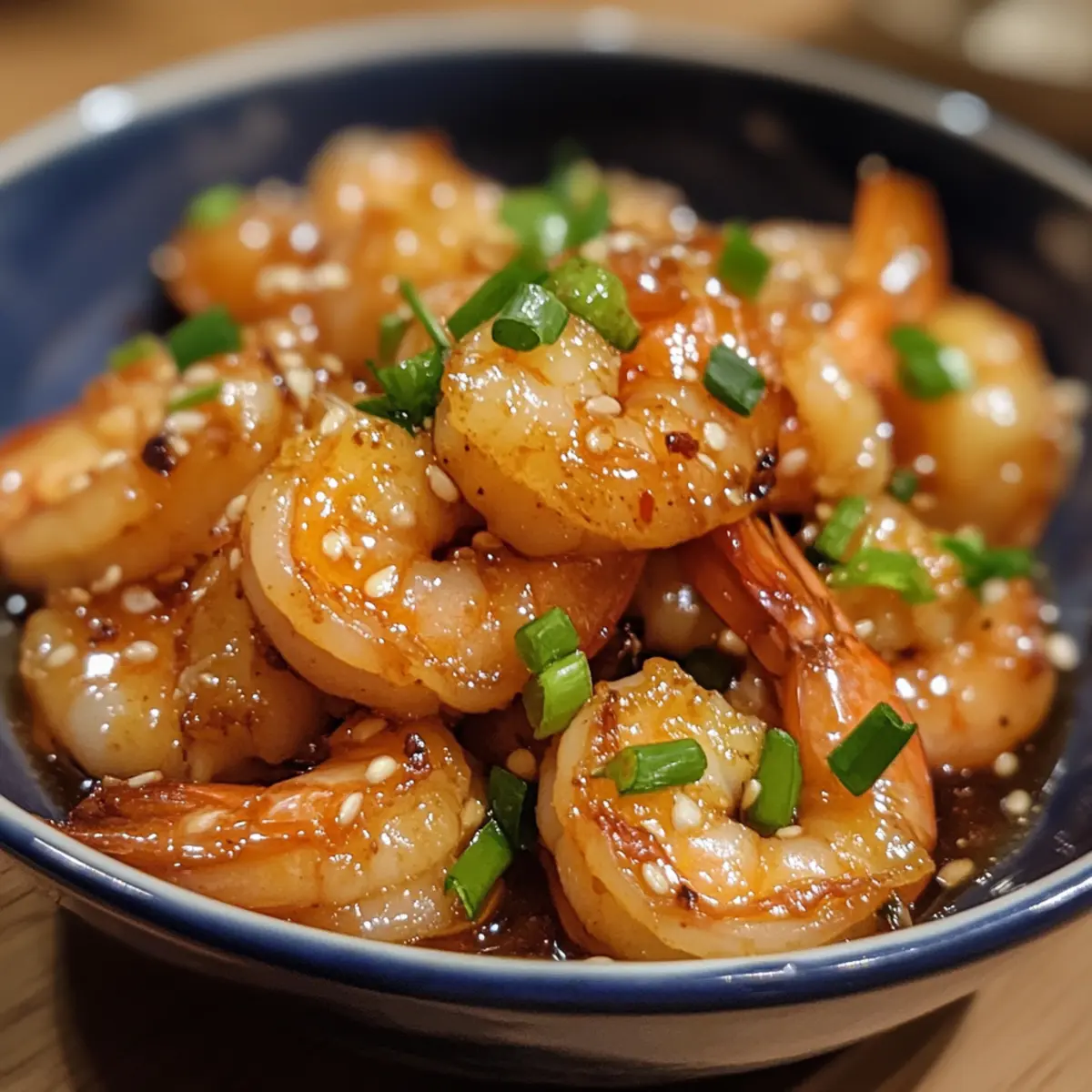 - Transfer the glazed shrimp to a serving platter, sprinkle sliced green onions and toasted sesame seeds on top, and enjoy immediately.