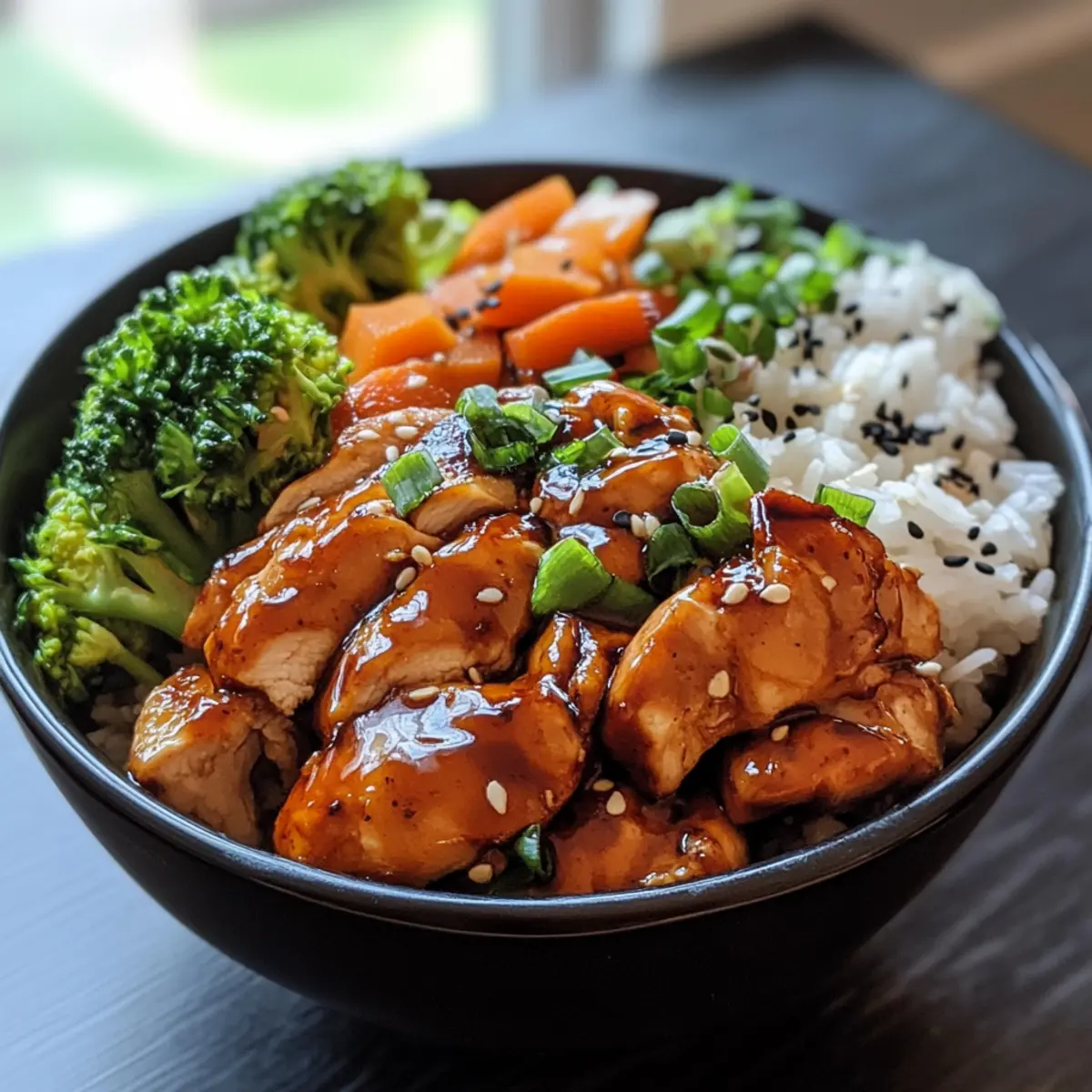 Assemble Bowls: Divide rice into bowls, top with sliced chicken and veggies. Drizzle extra sauce and sprinkle green onions and sesame seeds.