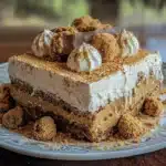Before serving, garnish your No-Bake Cookie Butter Icebox Cake as desired. You can sprinkle chocolate shavings, crushed Biscoff cookies, or drizzle melted cookie butter over the top. A dusting of cocoa powder or a sprinkle of cinnamon also adds a nice touch. Slice and serve chilled. Each bite will be a delightful combination of creamy cookie butter filling and soft, spiced cookies. Prepare for rave reviews! You’ve just created a stunning and incredibly easy no-bake dessert that’s perfect for any occasion.