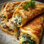There are certain recipes that become more than just food; they become a tradition, a comforting ritual that punctuates the rhythm of family life. For us, these Savory Spinach and Cheese Crepes are exactly that. I still remember the first time I decided to make them. It was a drizzly Sunday, the kind of day that calls for something special yet cozy. I had always been intimidated by crepes, thinking they were the exclusive domain of French bistros and professional chefs. But the allure of a delicate, paper-thin pancake wrapped around a warm, gooey filling of spinach and melted cheese was too strong to resist. The kitchen soon filled with the rich, nutty aroma of browning butter and the fresh, earthy scent of sautéed garlic and spinach. My family, drawn by the smells, gathered around the counter, watching with anticipation as I swirled the batter and flipped the first, admittedly imperfect, crepe. By the third one, I had found my rhythm. We sat down to eat, and the silence that followed the first bite was the highest compliment. The crepes were tender and light, a perfect contrast to the creamy, savory, and deeply satisfying filling. Since that day, this recipe has become our go-to for everything from lazy weekend brunches to elegant, yet surprisingly simple, weeknight dinners. It’s a recipe that never fails to impress and proves that a little bit of butter, flour, and love can create something truly magical.