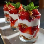 There’s a certain magic that happens when simple, fresh ingredients come together to create something truly special. I discovered this firsthand on a warm spring morning when I was craving something light, refreshing, yet satisfying. My fridge held a carton of vibrant red strawberries and a pot of creamy Greek yogurt, and a small mint plant was thriving on my windowsill. The idea for this Strawberry Mint Yogurt Parfait was born out of that simple desire for freshness. I layered the sweet, macerated strawberries, infused with the cool aroma of mint, with thick, tangy yogurt and a sprinkle of crunchy granola. The result was more than just a breakfast; it was an experience. The first spoonful was a perfect harmony of textures and flavors – the juicy pop of the berries, the cool whisper of mint, the rich creaminess of the yogurt, and the hearty crunch of the oats. When I served it to my family, the initial silence was followed by a chorus of “Wow!” It has since become our go-to recipe for everything from a quick, energizing breakfast on busy weekdays to an elegant, healthy dessert for weekend gatherings. It’s the kind of recipe that looks impressive and tastes even better, yet is deceptively simple to create. This parfait isn’t just food; it’s a small celebration in a glass, a reminder of how beautiful and delicious simplicity can be.